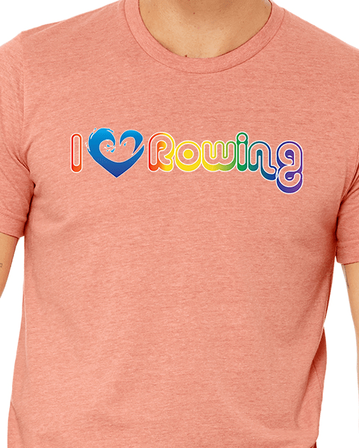 This retro “I Love Rowing” design is on a heathered light orange combed, ring-spun cotton, and polyester blend t-shirt.